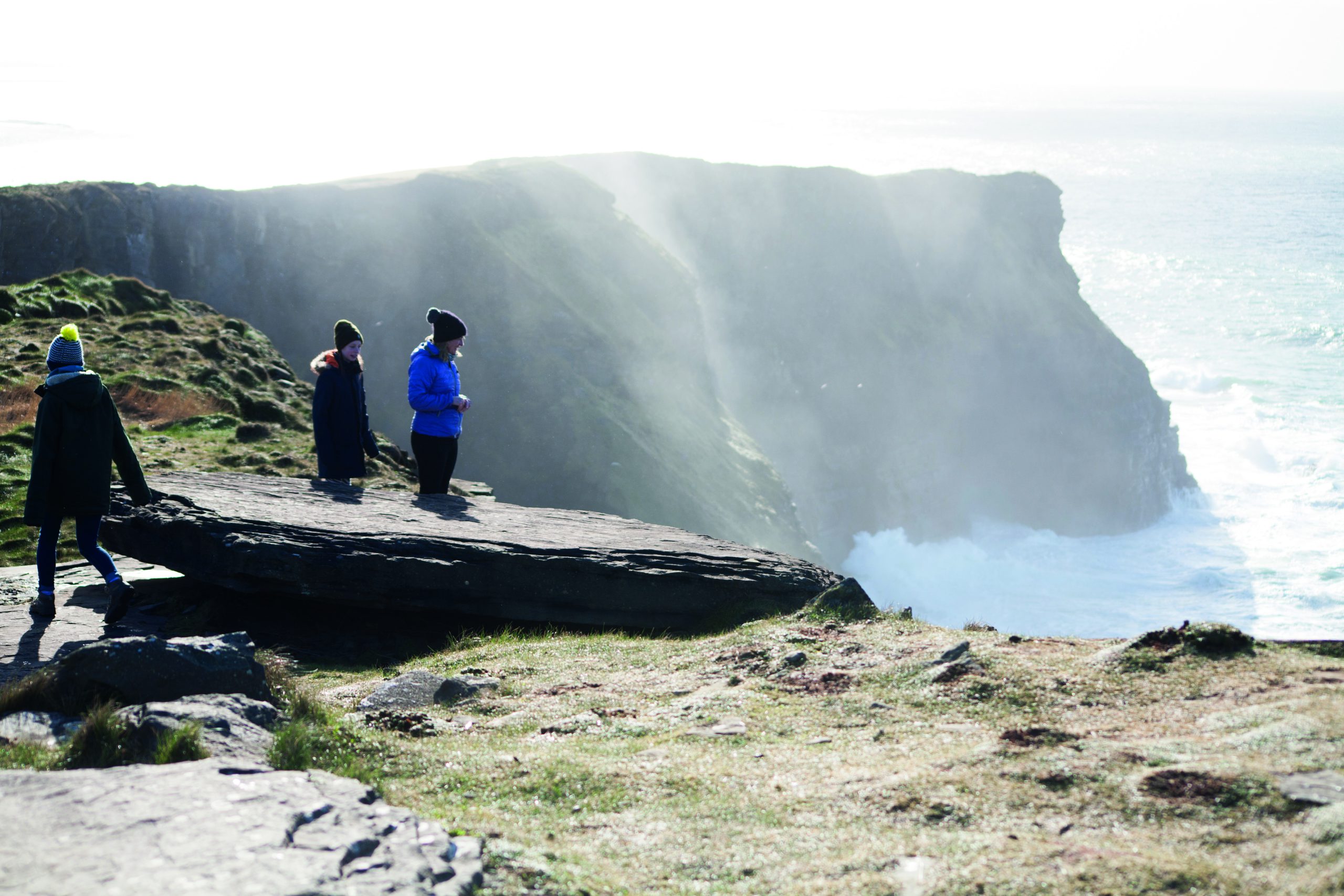 the starting point for a visit to the fearsome Cliffs of Moher, Ireland’s most visited natural attraction. Each year a million visitors come in cars and coaches to gawp at the sheer drops here. You can understand why – the cliffs are 700ft tall and five miles wide and are absolutely terrifying. I’m all up for giving them a miss until we pass a little homemade sign (just after the main visitor centre) to parking. We wind up at the southern end of the cliffs in someone’s front garden, an entrepreneur charging €2 to park. From there it’s a kilometre walk to the Cliffs of Moher with few other people around, and certainly no tourist buses. We peer over the edge as seabirds fly around and sea mist rises up from the Atlantic far below.